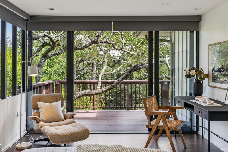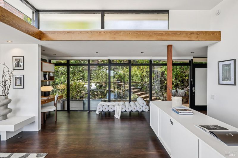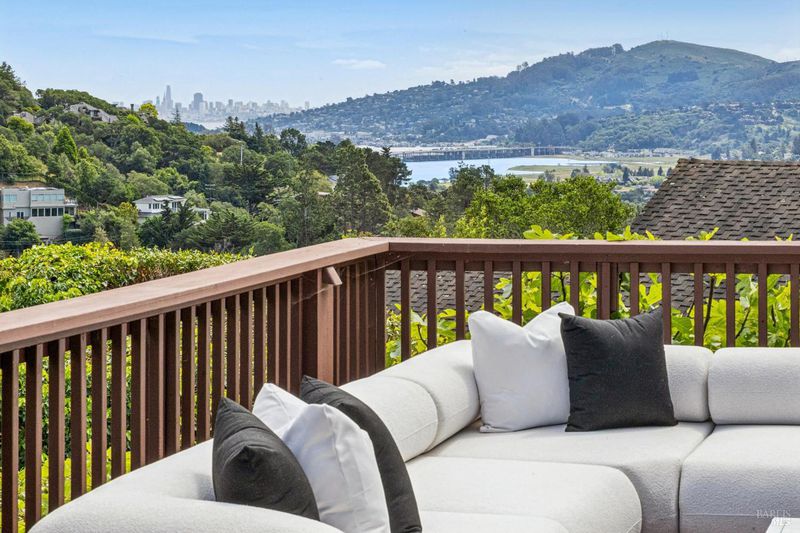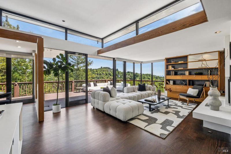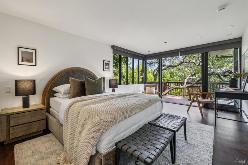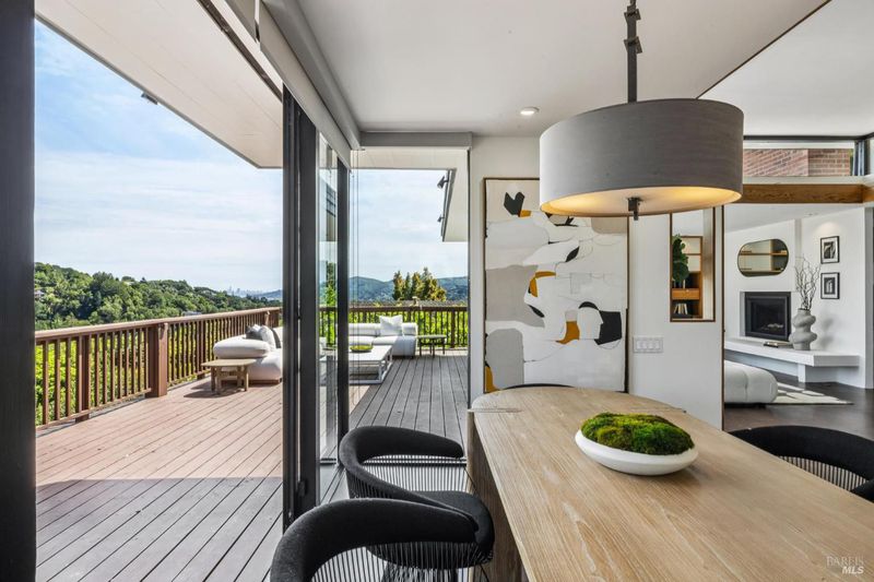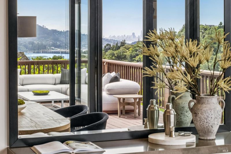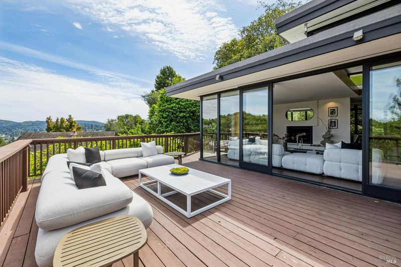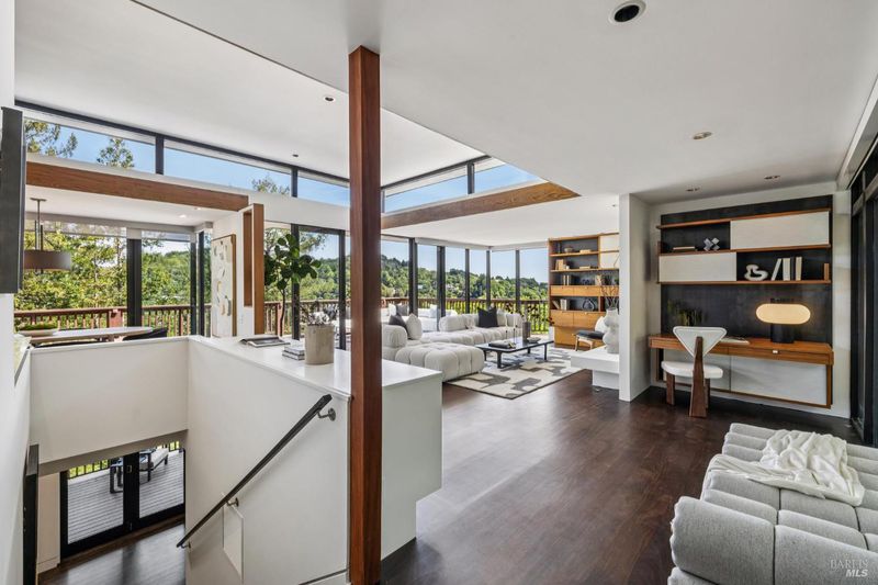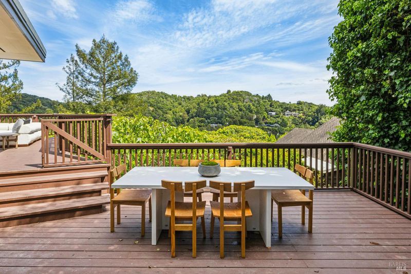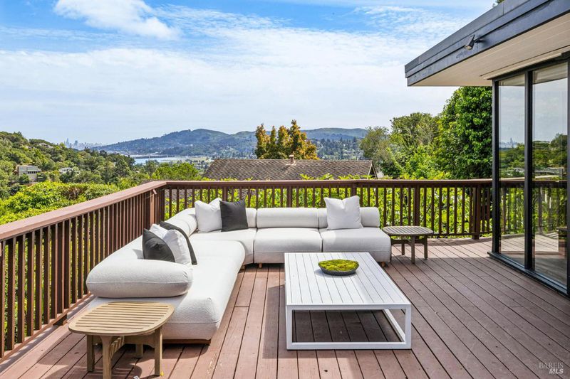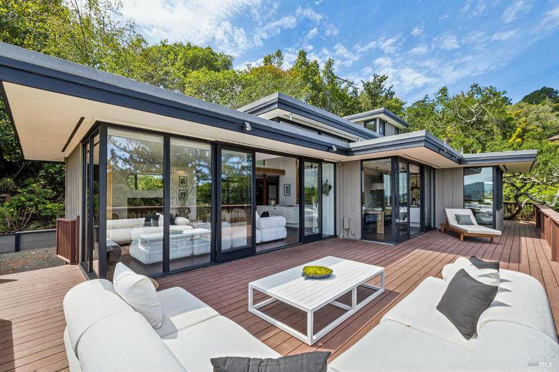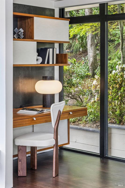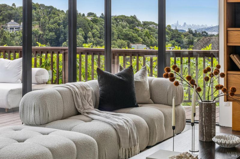 This private mid-century-inspired residence captures the quiet magic of Mill Valley living, where sweeping city views unfold beyond walls of tall windows and a thoughtfully curated interior aesthetic creates a home that feels both grounded in nature and architecturally striking. A welcoming entry garden offers a serene arrival. Inside, the home's striking design is elevated by custom-designed shelving and thoughtful architectural details that bring warmth, rhythm, and visual depth throughout the living spaces. The chef's kitchen blends function with refinement, featuring premium appliances including a Miele oven, Viking microwave, Wolf four-burner cooktop, Bosch dishwasher, and Sub-Zero refrigerator. The main level is enveloped in warmth, where richly layered wood tones and custom paneling create a grounded yet elevated atmosphere throughout the living spaces. Also on this level are two well-appointed bedrooms served by a thoughtfully designed shared bathroom featuring a sculptural custom sinkan architectural focal point that reflects the home's refined material palette and intentional design sensibility. From the main living level, an expansive upper deck extends the home's living space into the canyon. The views canyon and city create a stunning setting. The transition from inside to out is seamless, the kind of flow that stops you the first time you step through the front door. The downstairs primary suite feels like a private retreat, opening to its own separate deck and complemented by a spa-like bathroom with dual sinks, a soaking tub, and a walk-in closet with integrated laundry. A dedicated office space below the garage completes the home quiet, flexible, and set apart from the main living areas. Set in the highly desirable Mill Valley neighborhood of Warner Canyon, surrounded by natural beauty and close to everyday conveniences, the property enjoys access to award-winning Mill Valley schools, nearby Boyle Park, vibrant downtown Mill Valley, and scenic hiking trailsoffering a rare balance of privacy, connection, and lifestyle.