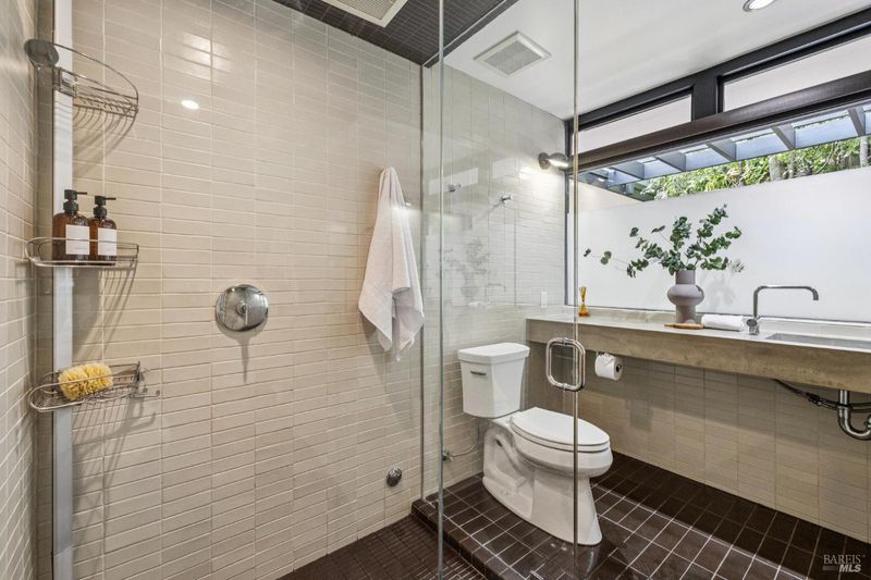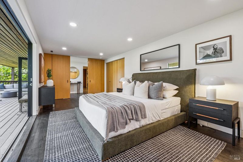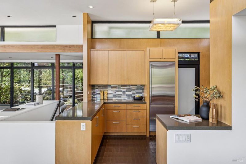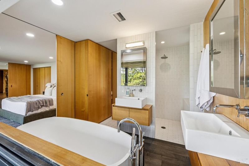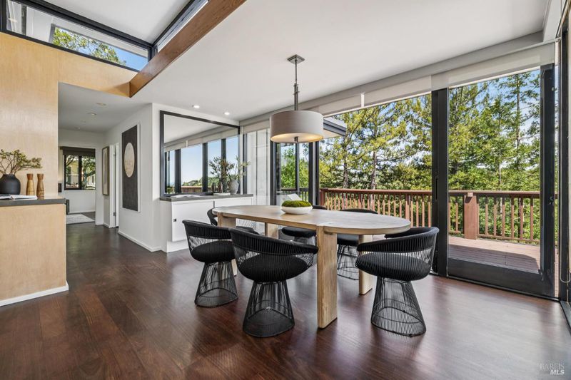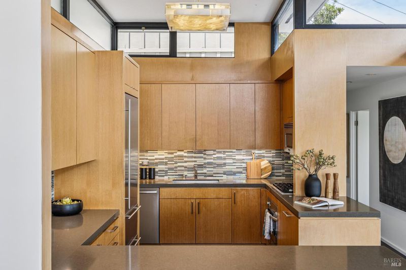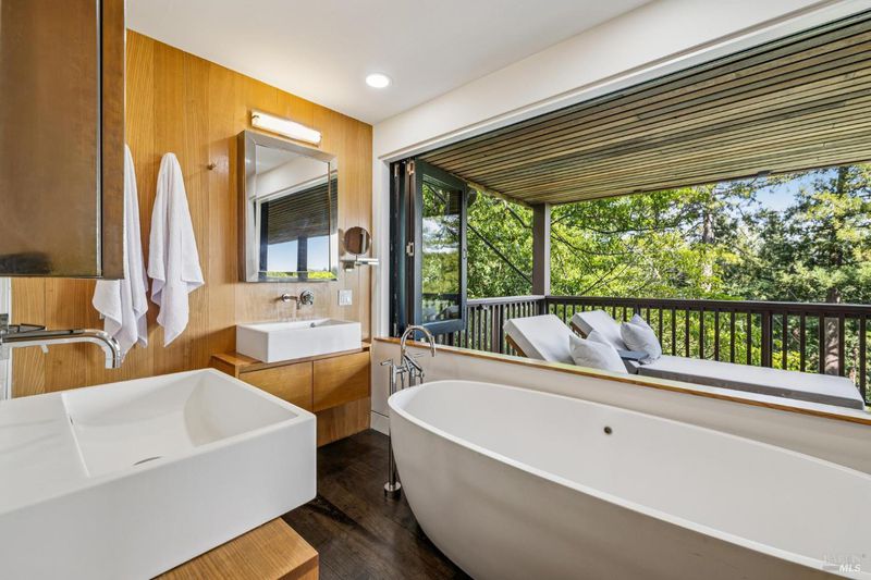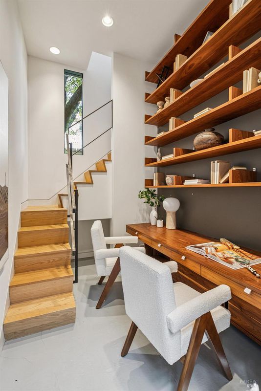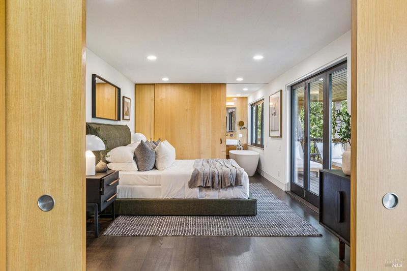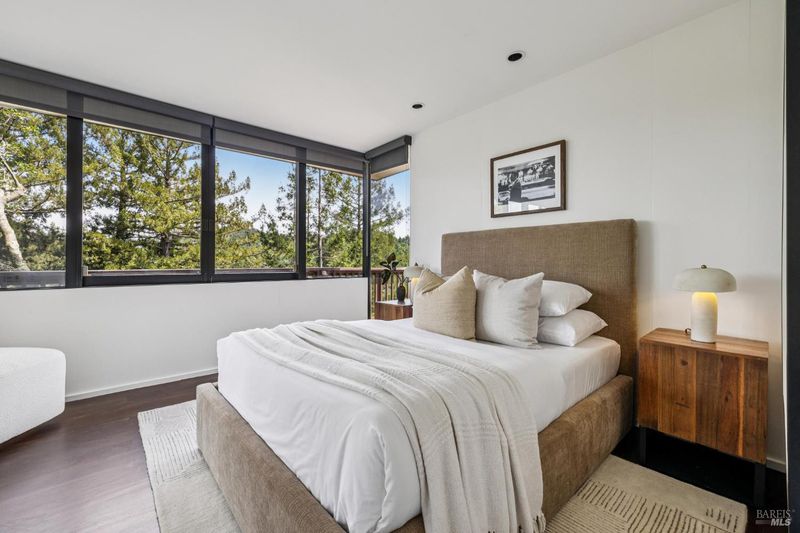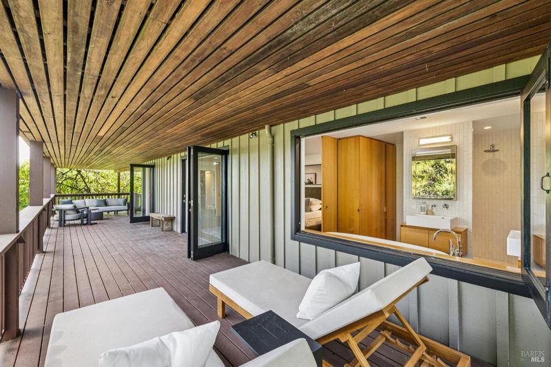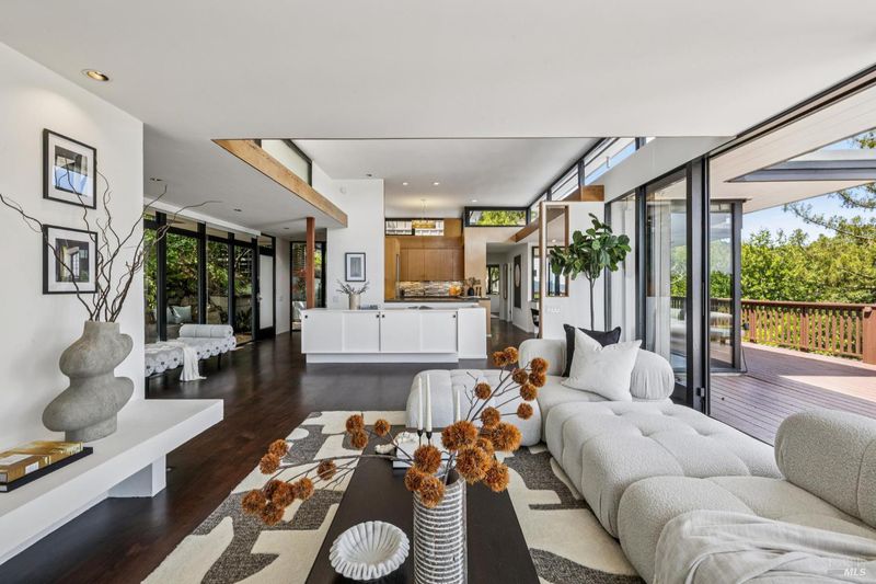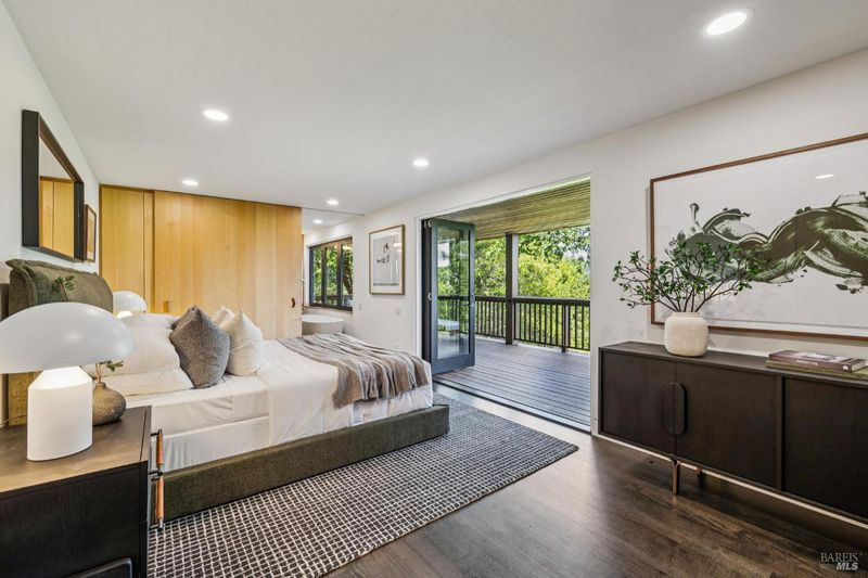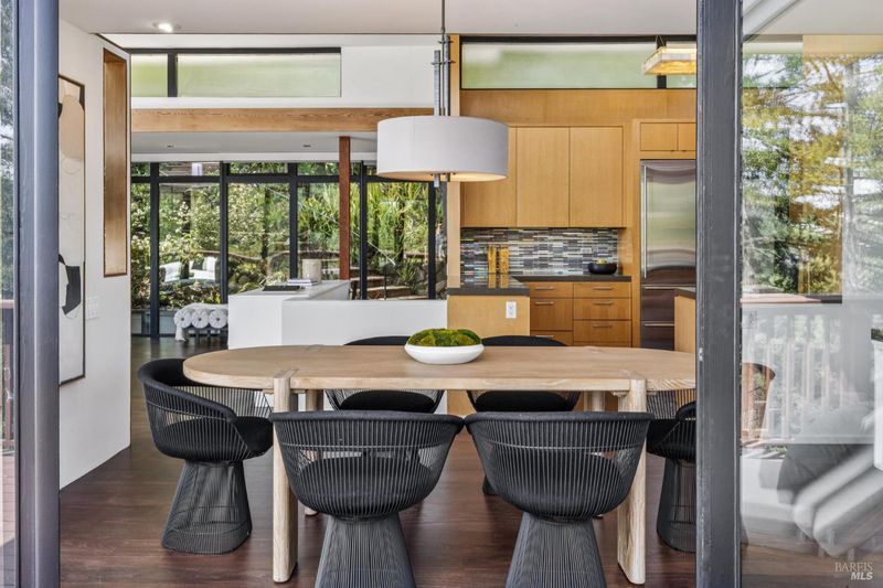 This private mid-century-inspired residence captures the quiet magic of Mill Valley living, where sweeping city views unfold beyond walls of tall windows and a thoughtfully curated interior aesthetic creates a home that feels both grounded in nature and architecturally striking. A welcoming entry garden offers a serene arrival. Inside, the home's striking design is elevated by custom-designed shelving and thoughtful architectural details that bring warmth, rhythm, and visual depth throughout the living spaces. The chef's kitchen blends function with refinement, featuring premium appliances including a Miele oven, Viking microwave, Wolf four-burner cooktop, Bosch dishwasher, and Sub-Zero refrigerator. The main level is enveloped in warmth, where richly layered wood tones and custom paneling create a grounded yet elevated atmosphere throughout the living spaces. Also on this level are two well-appointed bedrooms served by a thoughtfully designed shared bathroom featuring a sculptural custom sinkan architectural focal point that reflects the home's refined material palette and intentional design sensibility. From the main living level, an expansive upper deck extends the home's living space into the canyon. The views canyon and city create a stunning setting. The transition from inside to out is seamless, the kind of flow that stops you the first time you step through the front door. The downstairs primary suite feels like a private retreat, opening to its own separate deck and complemented by a spa-like bathroom with dual sinks, a soaking tub, and a walk-in closet with integrated laundry. A dedicated office space below the garage completes the home quiet, flexible, and set apart from the main living areas. Set in the highly desirable Mill Valley neighborhood of Warner Canyon, surrounded by natural beauty and close to everyday conveniences, the property enjoys access to award-winning Mill Valley schools, nearby Boyle Park, vibrant downtown Mill Valley, and scenic hiking trailsoffering a rare balance of privacy, connection, and lifestyle.