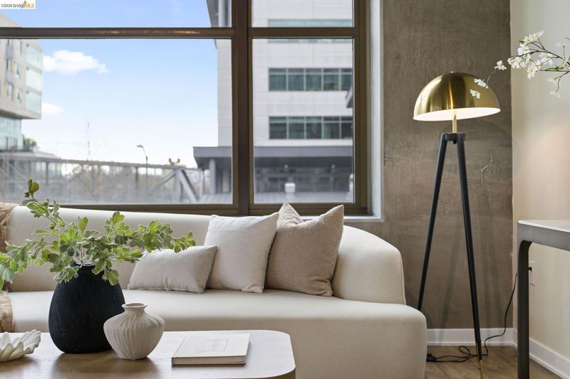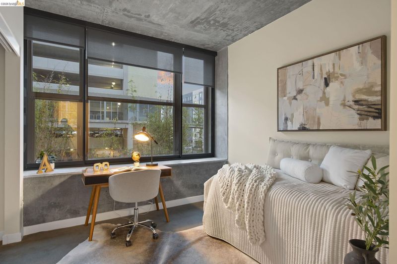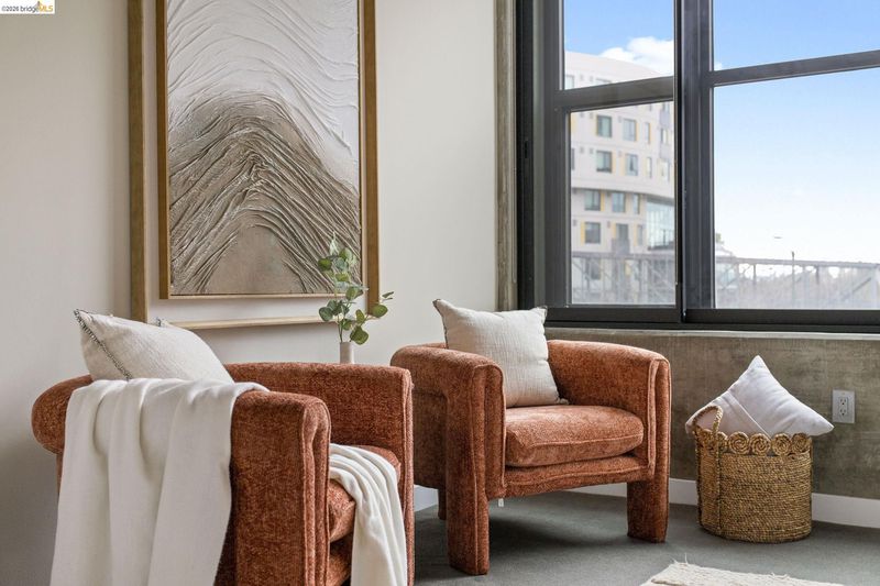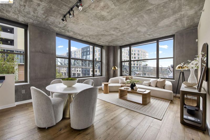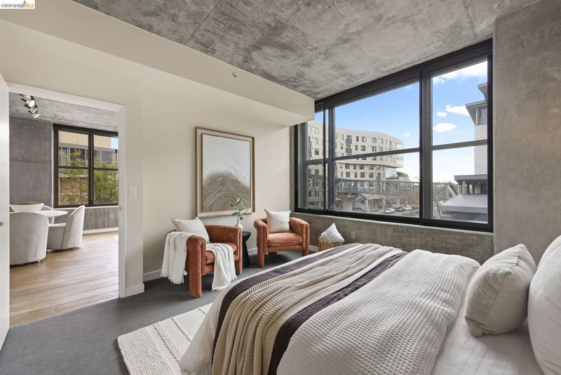 An incredible opportunity at The Bond—this two-bedroom, two-bath corner condo offers 1,260 sq ft of light-filled urban living in Jack London Square. The split-bedroom layout provides privacy, while open living and dining areas are perfect for entertaining. Loft-inspired details include exposed concrete walls and ceilings combined with sleek white walls and DuChateau wood floors. The chef’s kitchen features Bertazzoni oven and microwave and Bosch dishwasher. A major highlight of this configuration that sets it apart is the spa-like primary suite with a standalone soaking tub, separate shower, dual sinks and walk in closet. Additional custom windows added in the bedrooms make this unit a stand out in the building. The secondary bedroom is a perfect space for a home office; guest room, or kids room with a bathroom (shower over tub) right next to it. There is also in-unit laundry with additional storage, and deeded one-car parking in a secure garage. The Bond is a fabulous top notch Jack London Square building with concierge service, business center, a modern hotel-esque lobby; gym, bbq/community area, and huge dedicated dog park - making this a sought after landing space for professionals, do-ers, travelers, furparents, commuters or work-from-homers. Come tour, and fall in love!