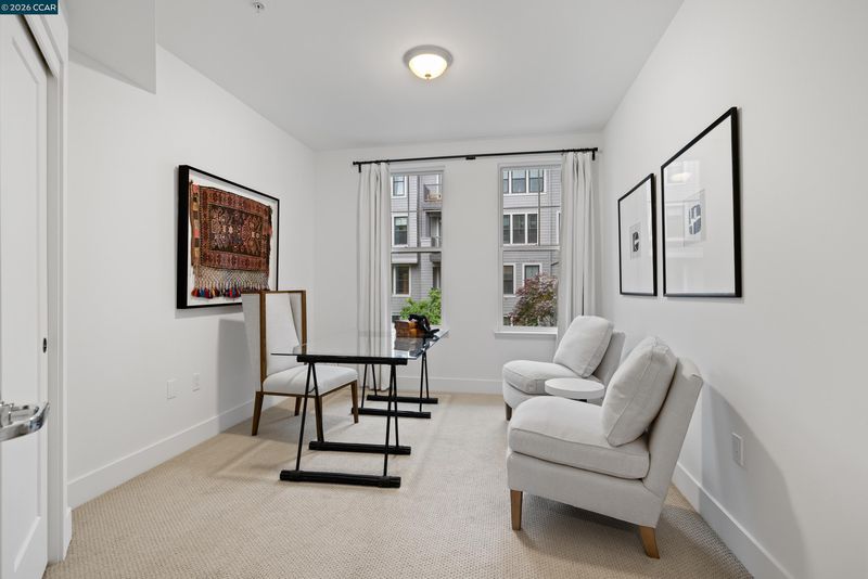 Welcome to this beautifully appointed 3-bedroom, 2-bathroom end-unit residence, ideally situated on the second floor with serene courtyard and creek views. Built in 2017, this modern home offers the perfect blend of style, comfort, and convenience in the heart of Lafayette. Flooded with natural light from expansive windows, the open-concept layout creates a bright and inviting atmosphere throughout the spacious living and dining areas. Thoughtfully designed with high-end finishes, the home features laminate wood flooring, new carpet in the bedrooms, and fresh interior paint, offering a truly move-in ready experience. The primary suite serves as a private retreat, complete with a walk-in closet and a beautifully appointed en-suite bath featuring dual sinks, a soaking tub, and a large walk-in shower. Additional amenities include in-unit laundry, central air conditioning, secure building access, and elevator convenience. Tandem parking spaces are ideally located near the elevator, adding ease to everyday living.