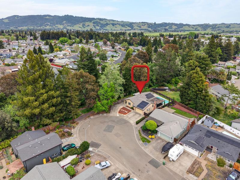 Just what you've been waiting for a four-bedroom, two-bath single-story Ranch style home at the end of a cul-de-sac, adjacent to a creek path. Step through the formal entry into a freshly painted interior with new tile flooring in the hallway, kitchen, and dining nook. A formal living and dining room welcome you at the front of the home, while the kitchen and family room combine at the rear, centered around a cozy wood stove. Both bathrooms have been tastefully updated with new or repurposed vanities, updated flooring, and tile wainscoting in the primary bath. Sliding doors from the family room and primary bedroom lead to a covered deck with a new roof and new flooring, perfect for relaxing or entertaining. Enjoy warm summer days in the in-ground pool. Additional improvements include a newer roof and solar (2021), an updated main electrical panel, and new dual-pane windows. Conveniently located just minutes from Sonoma State University, SMART train access, schools, the golf course, and Rohnert Park Community Center. Come take a look.