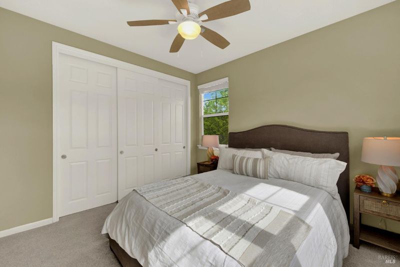 Charming two-story home with classic curb appeal, ideally situated on a quiet court. A welcoming covered front porch with stone accents and white railing creates an inviting place to relax and enjoy the neighborhood. The attractive faade features large windows that fill the home with natural light and a warm red front door that adds character. The manicured front yard offers lush lawn and thoughtfully designed landscaping, enhancing the home's picturesque setting. A spacious attached two-car garage provides everyday convenience. The backyard is a private, tree-studded retreat with mature landscaping, offering a peaceful setting ideal for outdoor dining, entertaining, or simply enjoying Napa's indoor-outdoor lifestyle.